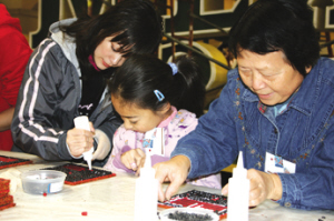 副會長鹿強當(dāng)天全家上陣,包括岳父岳母和妻子兒女在內(nèi)的一家六口全都來到了粘花現(xiàn)場,一起為世博會花車中國館模型粘貼由紅豆和黑豆組成的吉祥圖案,岳父方先生一邊干活一邊表示,能為世博會花車出一份力,這是他們?nèi)业淖院馈?/p>