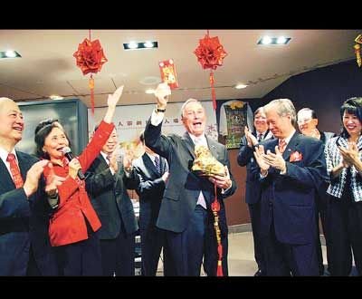中新網(wǎng)2月25日電 據(jù)美國《僑報(bào)》報(bào)道,紐約市長彭博23日來到華策會人瑞中心,向華裔耆老拜年。人瑞中心主任伍寶玲按華人過年傳統(tǒng)給彭博送上仿真金馬、金虎和紅包,彭博喜笑顏開,開心地摸著虎頭,希望給紐約帶來好運(yùn)。