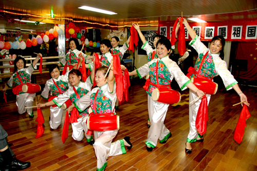 當天的聯(lián)歡會上,婦女會的姐妹們表演了新創(chuàng)作排練的腰鼓舞蹈,育才學(xué)園小朋友們表演了集體詩朗誦,趙永平、惠青等朗誦了《祖國我愛你》長詩。在王燕文小姐領(lǐng)唱下,全體與會人員還起立演唱了歌唱祖國的大合唱。隨后,趙永平會長、孫總領(lǐng)事以及與共和國同齡的姐妹們一起切開了慶祝祖國六十周年的生日蛋糕。