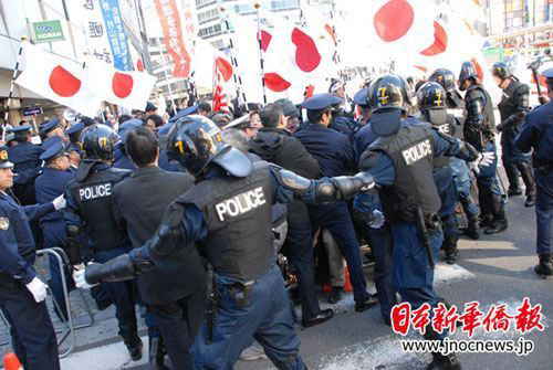 面對右翼分子的叫囂,“陽光城”的華人員工顯得非常沉著冷靜,依然熱情接待來到這里的每一位客人。在現(xiàn)場,日本警方也積極維護(hù)華人不受傷害。右翼分子在講演中攻擊中國留學(xué)生,一位中國女留學(xué)生勇敢地站出來,大聲說:“我是中國人,是中國留學(xué)生,你們都是‘右翼垃圾’!”當(dāng)右翼分子要對這名女學(xué)生動手時,警員立即沖過來加以保護(hù)。