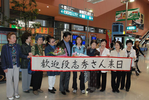 4月19日下午,北川女孩段志秀與李廣宏一起走下飛機,在關(guān)西機場,在此等候的日本友人向段志秀獻花,并鼓勵她在日本早日戰(zhàn)勝病魔,段志秀在機場說:“我要在日本學習很多有關(guān)抗震的知識,并打算將來到日本留學!(渡邊)