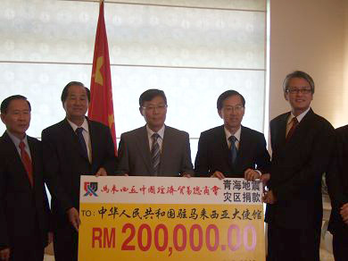 中新網(wǎng)5月6日電 據(jù)中國外交部網(wǎng)站消息,近日,馬來西亞馬中經(jīng)貿(mào)總商會、馬華公會公共服務及投訴局以及華商Yap Kim San 先生前來中國駐馬來西亞使館,轉交向青海玉樹地震災區(qū)捐款。