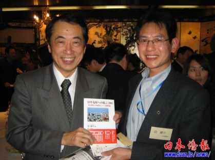 曾經(jīng)擔任全日本中國留學人員友好聯(lián)誼會會長多年的東北師范大學研究生院國際教育處處長的李光哲博士,接受《日本僑報》記者的國際電話采訪時,回憶了和菅直人交流的愉快時光,對菅直人當選日本新的首相感到由衷的高興。李博士曾經(jīng)多次參加菅直人主辦的中國留學生交流會,并代表中國留學生向菅直人贈送了《留日百年巡禮》紀念畫冊等,李光哲說,菅直人當選新的首相,無論對中日關(guān)系、對在日中國留學生來說,都是非常好的事情。