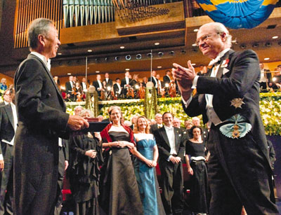 中新網(wǎng)12月11日電 2009年諾貝爾獎頒獎禮昨在瑞典斯德哥爾摩演奏廳舉行,一生獲獎無數(shù)的光纖之父、前香港中文大學(xué)校長高錕,正式從瑞典國王古斯塔夫.卡爾16世(Carl XVI Gustaf)手中接過諾貝爾物理學(xué)獎。期間大會更為他作出特別安排,由國王走到其座位旁邊頒獎,盛裝出席的他,以燦爛的笑容迎接氣氛莊嚴但歡樂的歷史性一刻。
