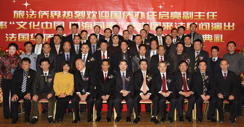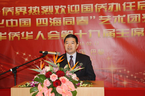 中新網(wǎng)2月18日電 當(dāng)?shù)貢r(shí)間17日晚,法國(guó)巴黎5區(qū)互助之家宴會(huì)廳花團(tuán)錦簇,一片歡歌笑語。旅法僑界在此舉行盛大招待會(huì),歡迎以中國(guó)國(guó)務(wù)院僑辦副主任任啟亮為團(tuán)長(zhǎng)的“文化中國(guó) 四海同春”藝術(shù)團(tuán)抵達(dá)巴黎,將為華僑華人和法國(guó)各界友人奉獻(xiàn)一臺(tái)中華文化藝術(shù)的盛宴。