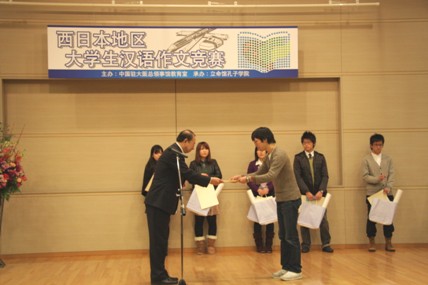 12月20日,中國(guó)駐大阪總領(lǐng)事館教育室在立命館大學(xué)舉行了西日本地區(qū)大學(xué)生中文作文比賽頒獎(jiǎng)儀式。教育室主任劉占山為獲得一等獎(jiǎng)的神戶市立外國(guó)語(yǔ)大學(xué)的渡部恒介同學(xué)頒發(fā)了榮譽(yù)證書(shū)和三萬(wàn)元的圖書(shū)卡獎(jiǎng)品。立命館孔子學(xué)院院長(zhǎng)周瑋生為獲得二等獎(jiǎng)的龍谷大學(xué)的北村籃子和關(guān)西外國(guó)語(yǔ)大學(xué)的增瀨有佑同學(xué)頒發(fā)了榮譽(yù)證書(shū)和一萬(wàn)元的圖書(shū)卡。獲得三等獎(jiǎng)的同學(xué)有龍谷大學(xué)的韓國(guó)留學(xué)生權(quán)純睦、神戶市外國(guó)語(yǔ)大學(xué)的油谷優(yōu)太、京都外國(guó)語(yǔ)大學(xué)相川瑞穗和神戶松蔭女子大學(xué)的古川翠。