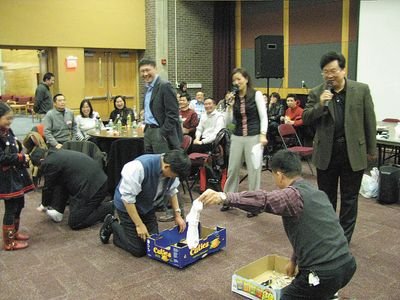 成語(yǔ)接龍和逢七數(shù)數(shù)也引爆了全場(chǎng)的笑聲,使全場(chǎng)沸騰的則是游戲“七拼八湊”。游戲中,呂敏偉將與會(huì)者分為“左派”和“右派”,要求兩派老師同心同德,以最快速度籌集現(xiàn)場(chǎng)報(bào)出的物品。兩派人員總動(dòng)員,紛紛將手表、錢、書(shū)包、鋼筆、口紅等取出,拋進(jìn)箱子。最令人捧腹的是,有的老師脫下了襪子,獻(xiàn)出了皮帶,最后由右派險(xiǎn)勝。當(dāng)天聯(lián)歡會(huì)上到處充滿歡聲笑語(yǔ),以及對(duì)彼此的新年祝福。
