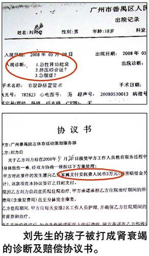 與楊先生同病相憐的還有東莞的劉先生,他的孩子在去年5月26日送進(jìn)一個(gè)訓(xùn)練營(yíng),訓(xùn)練期也是三個(gè)月,繳費(fèi)13100元,而30日孩子便被送進(jìn)醫(yī)院,經(jīng)醫(yī)生診斷為毆打、缺乏飲用水造成的腎衰竭。劉先生說,訓(xùn)練營(yíng)的訓(xùn)練內(nèi)容“基本上沒有心理輔導(dǎo),只有少得可憐的法制教育,其余的全部都是‘生理輔導(dǎo)’和軍事訓(xùn)練”。