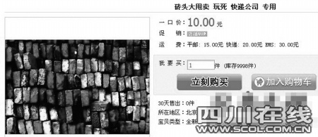 近日,店主“千尋kission”在淘寶網(wǎng)上發(fā)布了“磚頭大甩賣(mài),玩死快遞公司專(zhuān)用”的銷(xiāo)售標(biāo)題,表示將以5元一斤的價(jià)格販賣(mài)磚頭。其中的產(chǎn)品說(shuō)明還頗有幾分《武林外傳》中呂秀才的風(fēng)采:“泄憤也可用磚頭,本磚頭專(zhuān)為對(duì)付那些服務(wù)態(tài)度不好的快遞送貨員設(shè)計(jì),如果你們對(duì)那些惹您生氣的快遞員投訴無(wú)門(mén),無(wú)處泄憤請(qǐng)拍下此產(chǎn)品!