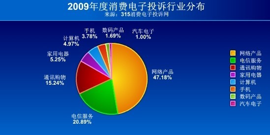 中新網(wǎng)3月12日電 中國電子商會頒布《2009年度消費電子產(chǎn)業(yè)售后服務(wù)藍皮書》(下稱“藍皮書”):《藍皮書》顯示:2009年,網(wǎng)絡(luò)產(chǎn)品以105438宗投訴居榜首位置,占據(jù)消費電子投訴的半壁江山,所占比例高達47.18%。排在二、三位的行業(yè)分別是電信服務(wù)和通訊購物,這三大行業(yè)的投訴量占了消費電子投訴量的八成以上。