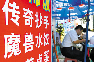 昨日上午,記者找到了位于萬豪酒店對面的“傳奇抄手”。這是一個臨街的小店面,面積有10平米左右。店面一旁,“傳奇抄手”四個大字赫然印于招牌上。如果說,“傳奇”算是比較普遍的詞匯,那“魔獸水餃”、“屠龍刀削”的取名,則肯定令玩家們耳熟能詳。