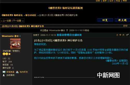 記者登陸《魔獸世界》中文官網(wǎng)臨時論壇發(fā)現(xiàn),網(wǎng)易已于昨晚發(fā)布《魔獸世界》例行維護(hù)公告,公告稱,為了保證服務(wù)器的穩(wěn)定運(yùn)行,將于11月3日凌晨 3:00 開始對現(xiàn)有全部服務(wù)器進(jìn)行例行維護(hù),停機(jī)時間預(yù)計為12小時左右。同時“客服電話服務(wù)”也將暫停12小時。