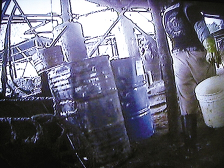 昨天下午,羊城晚報(bào)記者以收購(gòu)“潲水油”為名,進(jìn)入該家煉油窩點(diǎn)。從泰龍工業(yè)園附近的一條小路拐入,穿過(guò)鐵路涵洞不到100米即到,門(mén)口以竹柵欄做門(mén),未見(jiàn)廠(chǎng)名或掛任何招牌,卻用木桿高高掛起一個(gè)油桶。人一走近門(mén)口,一陣難聞的餿臭味便迎面撲來(lái),入門(mén)左側(cè)堆放了幾十個(gè)空油桶,還有一堆堆榨剩的油渣。場(chǎng)內(nèi)中央并排連著十幾個(gè)大水泥池,池內(nèi)裝填有大量剩飯剩菜等食品垃圾,空氣里彌漫著惡臭,令人掩鼻;再往里走,是一架帶有發(fā)動(dòng)機(jī)的簡(jiǎn)陋榨油機(jī),機(jī)器轟鳴聲中,不斷有深黃色的油液被擠出,滴到榨油機(jī)下方的一個(gè)槽里;旁邊還有幾個(gè)貌似用作煮油的圓筒裝置,周?chē)臀蹪M(mǎn)地。記者現(xiàn)場(chǎng)看到,場(chǎng)內(nèi)沒(méi)有一間固定建筑,全是用木頭、鎂瓦搭建起來(lái)的粗陋臨時(shí)棚寮。