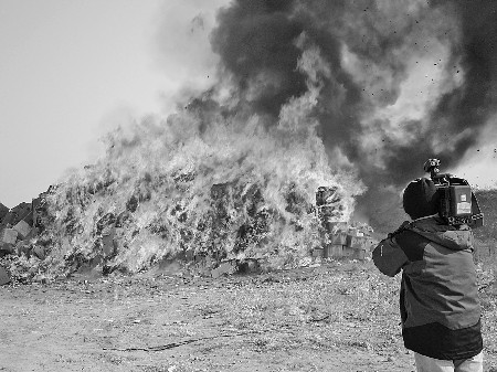 上午10:30左右,在經(jīng)過(guò)假劣藥械移交銷毀簽字儀式之后,點(diǎn)火開(kāi)始。出席現(xiàn)場(chǎng)會(huì)議的相關(guān)領(lǐng)導(dǎo)首先點(diǎn)燃火把,引燃了浸透柴油的“藥山”。火苗躥起幾十米高,熊熊的火焰頓時(shí)吞噬了數(shù)以萬(wàn)計(jì)的偽劣藥械。熱浪掀起的滾滾濃煙中不時(shí)傳來(lái)響亮爆炸之聲,不少灌裝液、氣體藥瓶被炸得飛上了天。