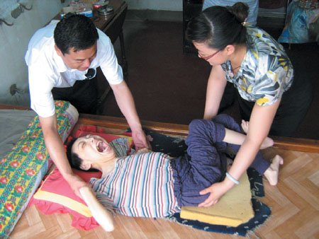 噩耗傳回村里后,大家本以為董英杰兩口子會放棄這個孩子,任她自生自滅,沒想到堅強的董英杰下定決心,一定要養(yǎng)活女兒。因為女兒沒有咀嚼能力,吞咽功能也近乎喪失,除了每天照顧女兒大小便外,女兒所吃的每一口飯,都是由她在自己嘴里一口一口嚼好,然后用舌頭把飯一口一口送進女兒嘴里,幫助她吞咽下去。村民們都說,這樣喂飯一口兩口容易,21年如一日,除了董英杰恐怕很少有人能堅持下來。董英杰寬厚的母愛不但感動了整個村子,連智力嚴重殘疾的女兒都被她感動了,穎欣認識母親,并能通過眼神與母親交流。