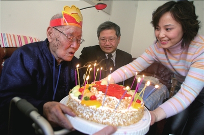 “一,二,三,吹……”長(zhǎng)壽肝癌患者王會(huì)川笑呵呵地接受眾人的祝福。昨天,在老人位于玉蜓橋附近的家中,北京中醫(yī)藥大學(xué)東方醫(yī)院的醫(yī)護(hù)人員為他提前慶祝生日。