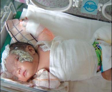 我的孩子啊,你才出生24天,你是如此的脆弱,還沒(méi)有來(lái)得及看這個(gè)世界,就受到如此非人的折磨,媽媽多么希望能代替你去承受這一切的災(zāi)難與痛苦。當(dāng)媽媽聽(tīng)到你第一聲啼哭,當(dāng)你第一次依偎在我懷里,心中歡喜之情無(wú)以言表,從此世間再?zèng)]有什么比你更重要,我還沒(méi)有來(lái)得及記住你可愛(ài)的笑容,你就已經(jīng)面目全非了……一想到你將來(lái)不能像正常人那樣行走,不能像正常人那樣生活的時(shí)候,我就萬(wàn)念俱灰,心如刀絞,你我該如何面對(duì)漫漫人生之路,我該如何向你解釋?zhuān)窟@又是誰(shuí)之過(guò)呢???