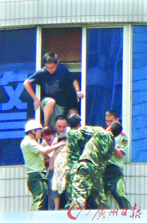 就在快靠近的時(shí)候,該名女子突然回過頭看到了救援官兵,前面的消防官兵迅速控制住該女子并奪下其手里的水果刀,另外兩名消防官兵也跟著上來死死地抓住該女子的雙手。女子在反抗過程中,狠狠地咬了一口其中一名消防官兵的手臂,留下了一個(gè)深深的牙印。機(jī)警的女護(hù)士則從另外一邊的窗口離開了平臺(tái)。