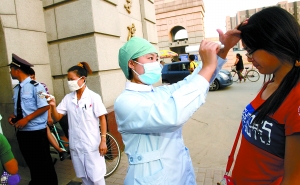 昨日,該校各個(gè)大門都有保安值守,檢查進(jìn)出人員的證件,并對(duì)入校人員進(jìn)行體溫檢測(cè)。一份23日發(fā)布的緊急通知稱:根據(jù)學(xué)校甲型H1N1流感形勢(shì)及上級(jí)防控特殊要求,開學(xué)第一周確定為甲流緊急防控期,教職工、學(xué)生必須體溫檢查。