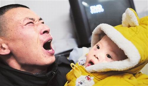 昨日(1月20日)下午,從彭州趕到成都的范冉和妻子廖繼軒來到成都市兒童醫(yī)院重癥監(jiān)護(hù)室,看望兒子范瑞。10個(gè)月大的范瑞在兒童醫(yī)院已經(jīng)住了3個(gè)多月,范瑞不僅臉色蒼白,還目光呆滯,因?yàn)樗侵钦蟽,并且還患有嚴(yán)重的先天性心臟病。據(jù)悉,范瑞原本住在成都市某醫(yī)院,但因?yàn)?個(gè)月前病危,被那家醫(yī)院轉(zhuǎn)送到成都市兒童醫(yī)院,直到現(xiàn)在。