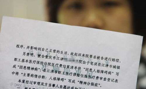 昨日,小玫趕到重慶向記者出示了調(diào)解書。法院查明,當(dāng)初醫(yī)院在小玫醫(yī)保住院醫(yī)療費(fèi)結(jié)算清單中將“因患人格障礙病”寫成“因患精神病”和在“職工醫(yī)保費(fèi)用審查登記表”病情診斷一欄中將“人格障礙”寫成了“精神分裂癥”,都是筆誤。經(jīng)過調(diào)解,醫(yī)院愿意將上述兩處“筆誤”改過來(lái),即把精神病的鑒定刪去,不過依然保留對(duì)患者有“人格障礙”的結(jié)論。小玫說作為調(diào)解的條件,她放棄了6萬(wàn)元的索賠請(qǐng)求。