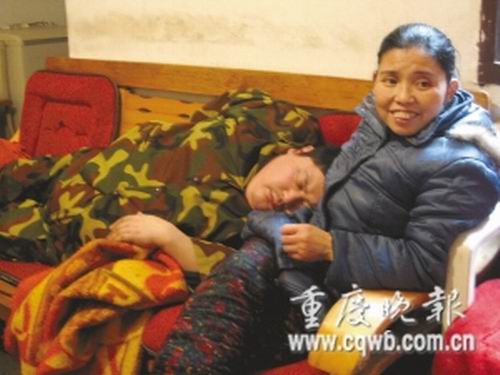 “亮亮,莫睡了,有人來看你了!鼻叭障挛,當(dāng)記者來到劉曉亮位于楊家坪街道天寶路的家時(shí),他正在客廳木制沙發(fā)上酣睡。身穿迷彩服的他,若不是露出的一雙光腳板,記者還以為是堆在沙發(fā)上的一堆厚棉絮。