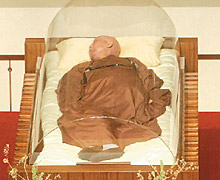 昨天政、商、宗教各界代表及信眾們前往瞻仰法師最后一面。方丈和尚向來賓講解懸掛堂中,書法家杜忠誥老師所寫的師父最后叮囑“寂滅為樂”以及四句偈“無事忙中老,空里有哭笑,本來沒有我,生死皆可拋。”說明圣嚴(yán)法師一向“歡喜看生死”的態(tài)度。