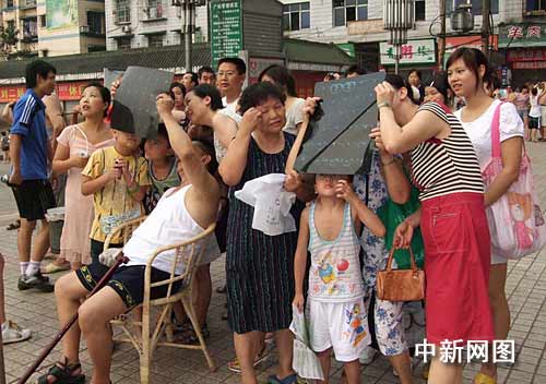 7月22日上午,500年一遇的日全食天文奇觀讓整個宜賓縣沸騰了,老老小小,男男女女都跑出來觀看。記者在現(xiàn)場看到,有戴著墨鏡觀看的,有拿望遠(yuǎn)鏡觀看的,有用焊工專用鏡觀看的,有拿茶葉包裝紙觀看的,有人用照相機(jī)照著相,有人用著攝像機(jī)……廣場上、院子里、壩壩頭到處站滿了人,大家都擠在一起驚嘆著:“看,太陽慢慢變小了,成月亮了,只有光圈了,天黑了……”