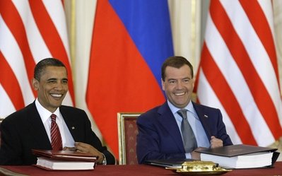 當(dāng)?shù)貢r間8日,俄羅斯總統(tǒng)梅德韋杰夫與美國總統(tǒng)奧巴馬在捷克首都布拉格城堡舉行會面,雙方進(jìn)行了私人會談。中午,兩人在捷克總統(tǒng)府西班牙大廳舉行了隆重的削減進(jìn)攻性戰(zhàn)略武器新條約簽署儀式。這被認(rèn)為是俄美“重塑”兩國關(guān)系的關(guān)鍵之舉。