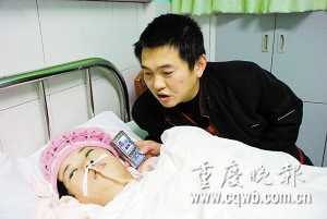 “小豬兒,來,聽聽歌曲!弊蛉丈衔11時,巴南區(qū)人民醫(yī)院神經(jīng)外科病房,42歲的趙江用手機播放著“你問我愛你有多深”。病床上,女友朱永萍眼睛似閉非閉,毫無反應(yīng)。