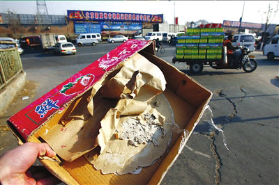 昨天下午,記者見到了這種紙箱。在箱子底部,貼有一張黃色草紙,摸起來凹凸不平。拿刀子割開草紙發(fā)現(xiàn),紙箱底部沾著一層“膩?zhàn)语灐,直徑約一尺,厚約3毫米,尚未完全干透。記者從市場內(nèi)找了一臺電子秤測量,這個特殊的箱子質(zhì)量有2斤1兩,而與之相同的一般紙箱不到一斤。