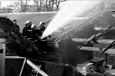 消防隊(duì)員在火場(chǎng)附近房頂上噴水滅火。本報(bào)記者夏永攝