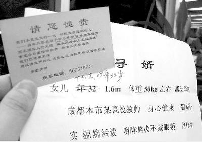 這是一份不同尋常的征婚啟事。它印在名片上。言語中,滿是自責(zé)。文字來自于父母:當(dāng)年只要求孩子學(xué)習(xí)再學(xué)習(xí),努力再努力,而不顧人倫天理,堅(jiān)決反對女兒交往異性,時至今日雖悔悟自責(zé),然女兒青春難再……