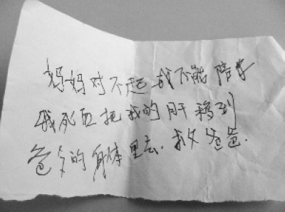 令崔女士怎么也沒(méi)有想到的是,1月24日中午12點(diǎn)半左右,當(dāng)她從醫(yī)院回到家,卻發(fā)現(xiàn)自家大門(mén)被反鎖了,“我只好從后院翻墻進(jìn)去,看到女兒躺在床上一動(dòng)不動(dòng),就像死了,旁邊有兩個(gè)安眠藥空瓶和一張遺書(shū),上面寫(xiě)著‘?huà)寢寣?duì)不起,我不能陪你,我死后把我的肝移到爸爸的身體里去,救爸爸!贝夼款D時(shí)覺(jué)得天旋地轉(zhuǎn),“這兩瓶安眠藥有200粒啊!女兒是23日傍晚五點(diǎn)多在醫(yī)院吃過(guò)晚飯回家的,到我發(fā)現(xiàn)的時(shí)候,有十多個(gè)小時(shí)了!