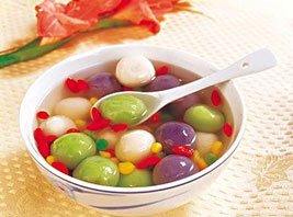 正月十五吃元宵,“元宵”作為食品,在我國(guó)也由來(lái)已久。宋代,民間即流行一種元宵節(jié)吃 的新奇食品。這種食品,最早叫“ 浮元子”后稱“元宵” ,生意人還美其名曰“元寶” 。元宵即"湯圓"以白糖、玫瑰、芝麻、豆沙、黃桂、核桃仁、果仁、棗泥等為餡,用糯米粉包成圓形,可葷可素,風(fēng)味各異?蓽、油炸、蒸食,有團(tuán)圓美滿之意。陜西的湯圓不是包的,而是在糯米粉中"滾"成的,或煮司或油炸,熱熱火火,團(tuán)團(tuán)圓圓。