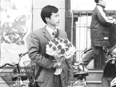 昨日上午9時許,記者在余家頭武商量販店門口看到,一個身體單薄的、穿藍(lán)色西裝的小伙子,手捧鮮花和禮品,在街頭等自己心愛的人已經(jīng)3天3夜了。記者看他面容已經(jīng)顯得有些憔悴,但是在記者和眾人的勸說下,他依然不愿離開,還要在那兒繼續(xù)癡癡地等待(見圖),以這種近乎瘋狂的求愛讓“女友”回心轉(zhuǎn)意。
