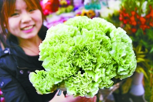綠色代表健康、充滿活力。大家通?吹降目的塑按蠖际羌t、黃、粉為主,綠色康乃馨因培植技術(shù)復(fù)雜等原因,極其罕見。在追求環(huán)保、簡約、時尚的三八婦女節(jié)為女性朋友送上一束綠色的康乃馨別有一番寓意。(劉潔攝)