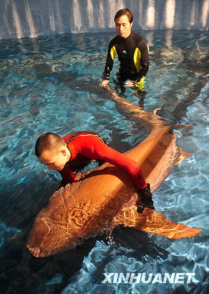 當日晚,廣東省漁政部門從廣州一家酒樓解救出一條護士鯊,并將其送到廣東省水生野生動物救護基地。據(jù)悉,此護士鯊為廣州某酒樓從水產(chǎn)市場購得,在酒樓水族箱里展示,接受食客們的預定。環(huán)保人士獲知后前往酒樓抗議護鯊,漁政部門隨即前往酒樓將其救出。護士鯊屬于廣東省野生保護動物,受到廣東地方保護法保護。新華社記者 盧漢欣 攝
