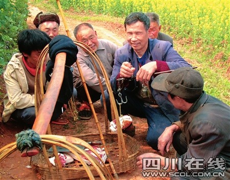 “割肉喲——”上午11點(diǎn)鐘,菜花叢中飛出抑揚(yáng)頓挫的聲音。循聲追去,見一盲人挑著肉擔(dān),拿著竹竿在鄉(xiāng)間小道上邊摸索前行,邊高聲吆喝!八褪菞钪心!”村民說(shuō)。