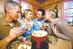 “奶酪火鍋”是瑞士最普遍、最具盛名的火鍋之一。瑞士人制作“奶酪火鍋”一般都是先以蒜涂抹于鍋底,再將不同口味的硬奶酪擦成碎末放入鍋中加熱成糊狀,再加淀粉、白葡萄酒、大蒜、奶油等,繼續(xù)煮并慢慢攪拌至完全融化呈濃濃的煉乳狀,最后放進(jìn)一些黑胡椒即可。上桌后,人們用長柄叉子叉著切成四五厘米見方的“法式長棍面包”蘸著奶酪吃,很像中國的“拔絲香蕉”。此外,吃這種火鍋時,瑞士人還特別喜歡配上有助于清口的風(fēng)干牛肉、腌酸黃瓜、小洋蔥。不過,吃這種火鍋一定要“點到為止”,雖然奶酪富于營養(yǎng),但很難消化,用白葡萄酒融化奶酪,就是為了幫助消化。