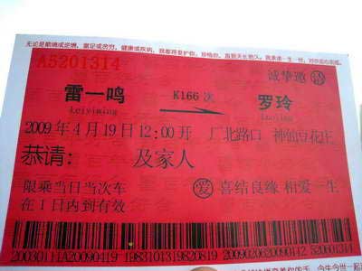 “太牛了,簡直就是個牛人!弊蛉罩形11時多,在婚禮現(xiàn)場,新郎的好友楊先生拿著明信片大小的“火車票”對記者說,原來來賓們手中所持的“火車票”都是結婚請柬,是由新郎雷一鳴自己設計的。