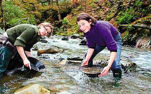 黛西便鼓動馬丁跟她一起去淘金, 以打造一對婚戒。說干就干,黛西和馬丁前往威爾士西部重鎮(zhèn)多爾蓋萊,在那里他們找到了一條有含金沙土的河流。在黛西的帶領下,他們在淺水河灘上挖了很多坑,淘出沙土用平底盤仔細篩查。