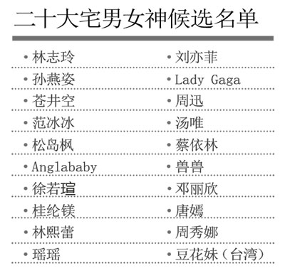 盡職的實習生同學們經(jīng)過幾個星期來的摸底調(diào)查,得出20大候選名單,其中,有大家熟悉的志玲姐姐、蒼井空老師,也有令人有些意外的孫燕姿、周迅同學,詳見20大候選名單。