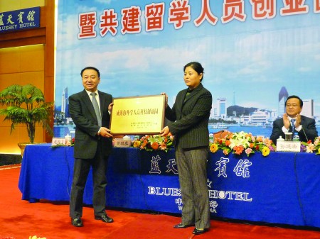 19日,山東省留學人員創(chuàng)業(yè)園建設現(xiàn)場會暨共建留學人員創(chuàng)業(yè)園授牌儀式在威海藍天賓館舉行。會上,山東省人力資源和社會保障廳向威海、濰坊和臨沂三市授予了共建留學人員創(chuàng)業(yè)園牌匾。據了解,“威海海外學人高科技創(chuàng)新園”由威海與32個留學人員團體共同創(chuàng)建,留學人員已創(chuàng)辦企業(yè)38家。(圖為省人力資源和社會保障廳廳長董國勛向威海頒發(fā)共建牌匾)。(劉潔)