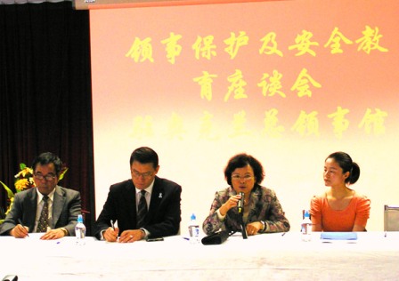 中新網(wǎng)11月30日電 據(jù)新西蘭中華新聞通訊社消息,25日下午,中國(guó)駐奧克蘭總領(lǐng)館在簽證大廳舉辦了一場(chǎng)華人及留學(xué)生領(lǐng)事保護(hù)安全座談會(huì)。廖菊華總領(lǐng)事主持會(huì)議,工黨華人國(guó)會(huì)議員霍建強(qiáng)、國(guó)家黨黃徐毓芳部長(zhǎng)助理鄭楠,以及特別邀請(qǐng)的三位華裔新西蘭警官出席了座談會(huì),他們先后就如何強(qiáng)化華人在新西蘭的法律及自我保護(hù)意識(shí)進(jìn)行講座。