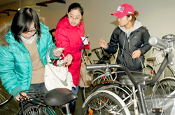 在服務(wù)項(xiàng)目的啟動儀式上,14名分別來自中國、越南和印度尼西亞的留學(xué)生來到活動現(xiàn)場。平和文化中心的工作人員們在啟動儀式上搞了個(gè)別出心裁的游戲,特意請這些留學(xué)生們從事先準(zhǔn)備好的30輛自行車中,分別按照型號和顏色各選出一輛最受歡迎的車。