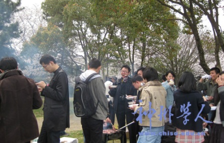 正午時分,同學們又回到賞花的大本營-----大濠公園櫻花樹下。“優(yōu)しい”的學友會負責人員已經為大家準備好了烤肉用的器具以及各種飲料。大家自覺地分成三、五人一組,圍著燒烤架邊聊天邊開始品嘗自己動手制作的美食。
