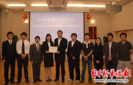 中新網那個5月28日電 據(jù)日本新華僑報網報道,5月25日上午,全日本中國留學生學友會副會長韓冰以及東京大學、東京工業(yè)大學、早稻田大學、埼玉大學、東京海洋大學、千葉大學、日本大學等7所大學的中國留學生學友會會長和代表來到教育處,將留日學子為青海省玉樹地震災區(qū)募集的第二批賑災款送到了教育處。第二批捐款總計日幣2,861,295元、人民幣1,000元。孫建明公使銜參贊代表教育處接受了來自留日學子的第二筆愛心捐款。
