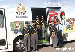 香港唯一的一輛道路安全巴士宣傳車每天流動于全港各區(qū)﹐車內(nèi)的各種示范演示﹐告誡人們遵守道路安全的重要﹐自啟用以來受到很好的效果。作者:趙振清
