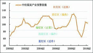 預警:2010年二季度,中經煤炭產業(yè)預警指數(shù)為103.3點,比上季度下降3.4點,在“綠燈區(qū)”內小幅回落。這主要因為產品銷售收入同比增速出現(xiàn)逆轉,產量有所下降等。